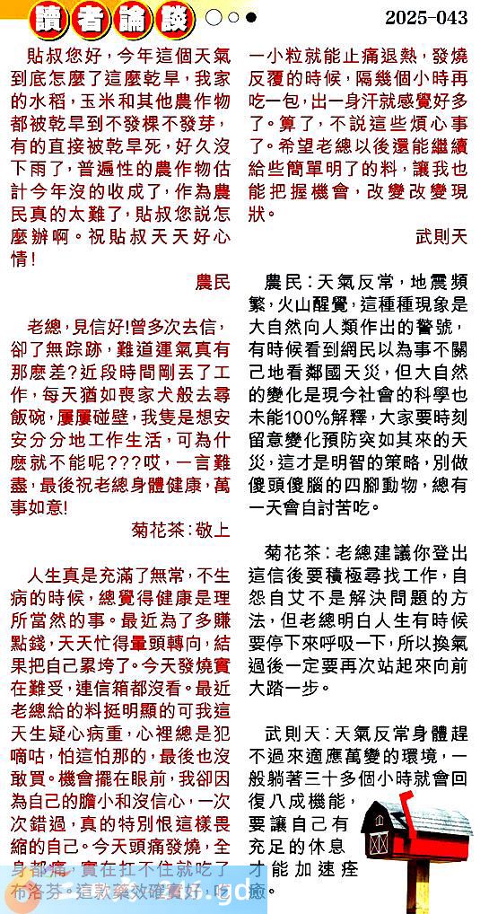 第零四三期讀者論談 1.貼叔您好,今年這個天氣到底怎麼了這麼乾旱,我家的水稻,玉米和其他農作物都被乾旱到不發棵不發芽有的直接被乾旱死,好久沒下雨了,普遍性的農作物估計今年沒的收成了,作為農民真的太難了,貼叔您說怎麼辦啊。祝貼叔天天好心情!農民 〖農民〗:天氣反常,地震頻繁,火山醒覺,這種種現象是大自然向人類作出的警號,有時候看到網民以為事不關己地看鄰國天災,但大自然的變化是現今社會的科學也未能100%解釋,大家要時刻留意變化預防突如其來的天災,這才是明智的策略,別做傻頭傻腦的四腳動物,總有一天會自討苦吃。 2.老總,見信好!曾多次去信,卻了無踪跡,難道運氣真有那麽差?近段時間剛丟了工作,每天猶如喪家犬般去尋飯碗,屢屢碰壁,我隻是想安安分分地工作生活,可為什麼就不能呢??哎,一言難盡,最後祝老總身體健康,萬事如意!菊花茶:敬上 〖菊花茶〗:老總建議你登出這信後要積極尋找工作,自怨自艾不是解決問題的方法,但老總明白人生有時候要停下來呼吸一下,所以換氣過後一定要再次站起來向前大踏一步。 3.人生真是充滿了無常,不生病的時候,總覺得健康是理所當然的事。最近為了多賺點錢,天天忙得暈頭轉向,結果把自己累垮了。今天發燒實在難受,連信箱都沒看。最近老總給的料挺明顯的可我這天生疑心病重,心裡總是犯嘀咕,怕這怕那的,最後也沒敢買。機會擺在眼前,我卻因為自己的膽小和沒信心,一次次錯過,真的特別恨這樣畏縮的自己。今天頭痛發燒,全身都痛,實在扛不住就吃了布洛芬。這款藥效確實好,吃一小粒就能止痛退熱,發燒反覆的時候,隔幾個小時再吃一包,出一身汗就感覺好多了。算了,不說這些煩心事了。希望老總以後還能繼續給些簡單明了的料,讓我也能把握機會,改變改變現狀。武則天 〖武則天〗:天氣反常身體趕不過來適應萬變的環境,一般躺著三十多個小時就會回復八成機能,要讓自己有充足的休息才能加速痊癒。