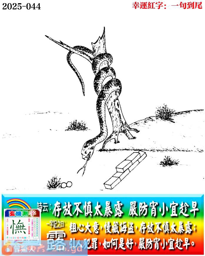 044期老版跑狗一字記之曰:【露】 詩雲:存放不慎太暴露,嚴防宵小宜趁早。 粗心大意,慢藏誨盜,存放不慎太暴露; 引人犯罪,如何是好,嚴防宵小宜趁早。 玄機測字:《憮》