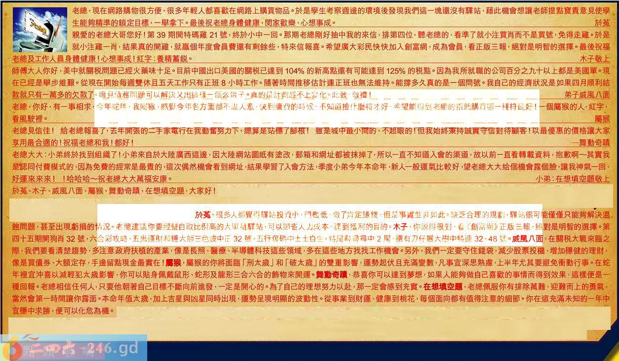 第051期《六合皇信箱文字版》10000%正確!!!正版二四六論壇*精心製作!!! 於菟、木子、威風八面、屬猴、舞動奇蹟、在想填空題,大家好! 【1】.老總,現在網路購物很方便,很多年輕人都喜歡在網路上購買物品。於是學生考察週邊的環境後發現我們這一塊還沒有驛站,藉此機會想讓老師提點寶貴意見使學生能夠精準的鎖定目標,一舉拿下。最後祝老總身體健康,閔家歡樂,心想事成。於菟 〖於菟〗:很多人都覺得驛站投資小,門檻低,做了肯定賺錢,但是事實並非如此。缺乏合理的規劃,驛站很可能僅僅只能夠解決溫飽問題,甚至出現虧損的情況。老總建議你要經營自取比例高的大單量驛站,可以節省人力成本,達到獲利的目的。 【2】.親愛的老總大哥您好!第39期開特碼雞21號,終於小中一回。那期老總剛好抽中我的來信,排第四位,聽老總的,看準了就小注買肖而不是買號,免得走雞。於是就小注雞一肖,結果真的開雞,就赢個年度會員費還有剩餘些,特來信報喜。希望廣大彩民快快加入創富網,成為會員,看正版三報,絕對是明智的選擇。最後祝福老總及工作人员身體健康!心想事成!紅字:養精蓄銳。木子敬上 〖木子〗:你說得很對,看《創富網》正版三報,絕對是明智的選擇。第四十五期開狗肖32號,六合彩攻略、五鬼運財和鍾大師三色波中正32號、五行奪碼中土土自生、特尾專尋尊中2尾、還有刀仔鋸大樹中特連32、48號。 【3】.師傅大人你好,美中就關税問題已經火藥味十足。目前中國出口美國的關税已達到104%的新高點還有可能達到125%的税點。因為我所就職的公司百分之九十以上都是美國單。現在已經是舉步維艱。從現在開始每週雙休且五天工作只有正班8小時工作。隨著時間推移估計連正班也無法維持。能撐多久真的是一個問號。我自己的經濟狀況是如果四月順利結款就只有一萬多的欠款了。眼見债務問题可以解決又出這樣個么蛾子。真的是計劃趕不上變化。此致,敬禮!弟子威風八面 〖威風八面〗:在關税大戰來臨之際,我們要看清楚趨勢,多注意政府扶植的產業,像是長照、醫療、半導體科技這些領域,多在這些地方找找工作機會。另外,我們一定要守住錢袋,減少股票投機,增加穩健的理財,像是買債券、大額定存,手邊留點現金最實在! 【4】.老總,你好,有一事相求,今年蛇年,我屬猴,感覺今年各方面都不盡人意,快到费的時候,不知道撿什麼符才好,希望能得到老總的指薦購買哪一種符最好!一個屬猴的人,紅字,看風駛裡。屬猴 〖屬猴〗:屬猴的你將面臨「刑太歲」和「破太歲」的雙重影響,運勢起伏且充滿變數,凡事宜深思熟慮,上半年尤其要避免衝動行事。在蛇年裡宜沖喜以減輕犯太歲影響,你可以貼身佩戴鼠形、蛇形及龍形三合六合的飾物來開運。 【5】.老總見信佳!給老總報喜了,去年開張的二手家電行在我勤奮努力下、緦算是站穩了腳根!雖是城中最小間的,不起眼的!但我始終秉持誠實守信對待顧客!以最優惠的價格讓大家享用最合適的!祝福老總和我!都好!舞動奇蹟 〖舞動奇蹟〗:恭喜你可以達到夢想,如果人能夠做自己喜歡的事情而得到效果,這樣便是一種回報。老總相信任何人,只要他朝著自己目標不斷向前進發,一定是開心的。為了自己的理想努力以赴,那一定會感到充實。 【6】.老總大大:小弟終於找到組織了!小弟來自於大陸廣西這邊,因大陸網站圖紙有塗改,郵箱和網址都被抹掉了,所以一直不知道入會的渠道,故以前一直看轉載資料,抱歉啊其實我是認同付费模式的,因為免费的經常是最貴的,這次偶然機會看到網址,結果學習了入會方法,季度小弟今年本命年,新人一般運氣比較好,望老總大大給個機會露個臉讓我神氣一回,好運來來來!!哈哈哈祝老總大大萬福安康。小弟:在想填空题敬上 〖在想填空題〗:老總佩服你有排除萬難,迎難而上的勇氣,當然會第一時間讓你露面。本命年值太歲,加上吉星與凶星同時出現,運勢呈現明顯的波動性。從事業到財運、健康到桃花,每個面向都有值得注意的細節。你在這充滿未知的一年中宜穩中求勝,便可以化危為機。 紅字:點頭咂嘴 暗码:04092948 [释义]表示同意、赞赏。 [出处]《儿女英雄传》第九回:“张老婆儿一旁看了,也不住的点头咂嘴。”