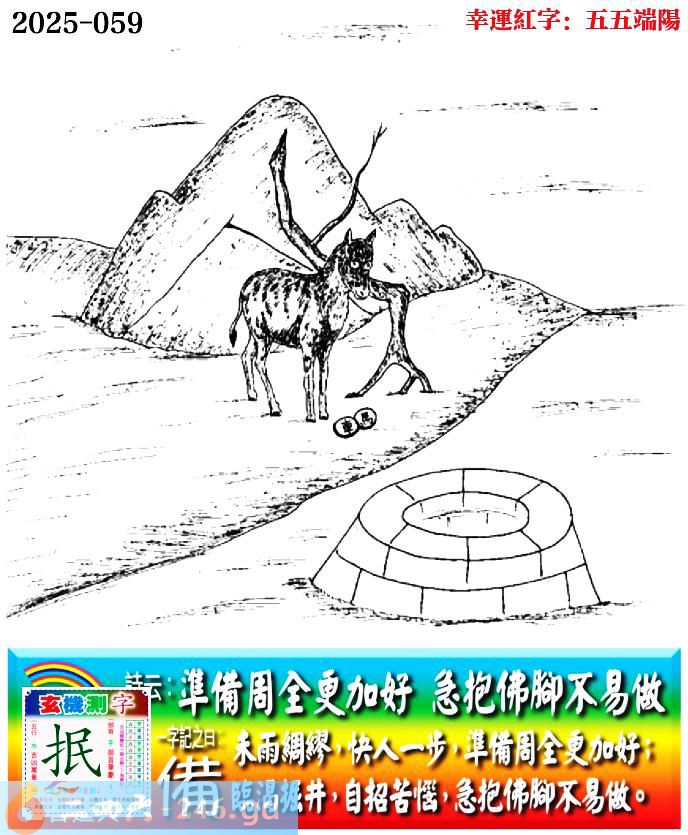 059期老版跑狗一字記之曰:【備】 詩雲:準備周全更加好,急抱佛腳不易做。 未雨綢繆,快人一步,準備周全更加好; 臨渴挖井,自招苦惱,急抱佛腳不易做。 玄機測字:《抿》