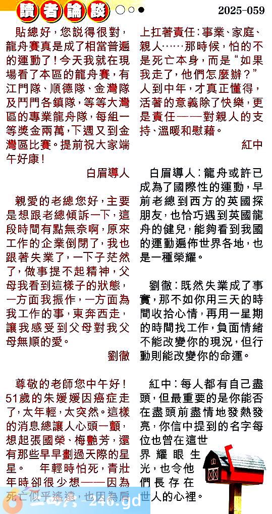 第零五九期讀者論談 1.貼總好,您說得很對,龍舟賽真是成了相當普遍的運動了!今天我就在現場看了本區的龍舟賽,有江門隊、順德隊、金灣隊及鬥門各鎮隊,等等大灣區的專業龍舟隊,每組一等獎金兩萬,下週又到金灣區比賽。提前祝大家端午安康!白眉導人 〖白眉導人〗:龍舟或許已成為了國際性的運動,早前老總到西方的英國探朋友,也恰巧遇到英國龍舟的健兒,能夠看到我國的運動遍怖世界各地,也是一種榮耀。 2.親愛的老總您好,主要是想跟老總傾訴一下,這段時間有點無奈啊,原來工作的企業倒閉了,我也跟著失業了,一下子茫然了,做事提不起精神,父母我看到這樣子的狀態,一方面我振作,一方面為我工作的事,東奔西走,讓我感受到父母對我父母無順的愛。劉徹 〖劉徹〗:既然失業成了事實,那不如你用三天的時間收拾心情,再用一星期的時間找工作,負面情緒不能改變你的現況,但行動則能改變你的命運。 3.尊敬的老師您中午好!51歲的朱媛媛因癌症走了,太年輕,太突然。這樣的消息總讓人心頭一顫,想起張國榮、梅艷芳,還有那些早早劃過天際的星星。年輕時怕死,青壯年時卻很少想因為死亡似乎遙遠,也因為肩上扛著責任:事業、家庭、親人......那時候,怕的不是死亡本身,而是“如果我走了,他們怎麼辦?’人到中年,才真正懂得,活著的意義除了快樂,更是責任一一對親人的支持、溫暖和慰藉。紅中 〖紅中〗:每人都有自己盡頭,但最重要的是你能否在盡頭前盡情地發熱發亮,你信中提到的名字每位也曾在這世界耀眼生光,也令他們長存在世人的心裡。