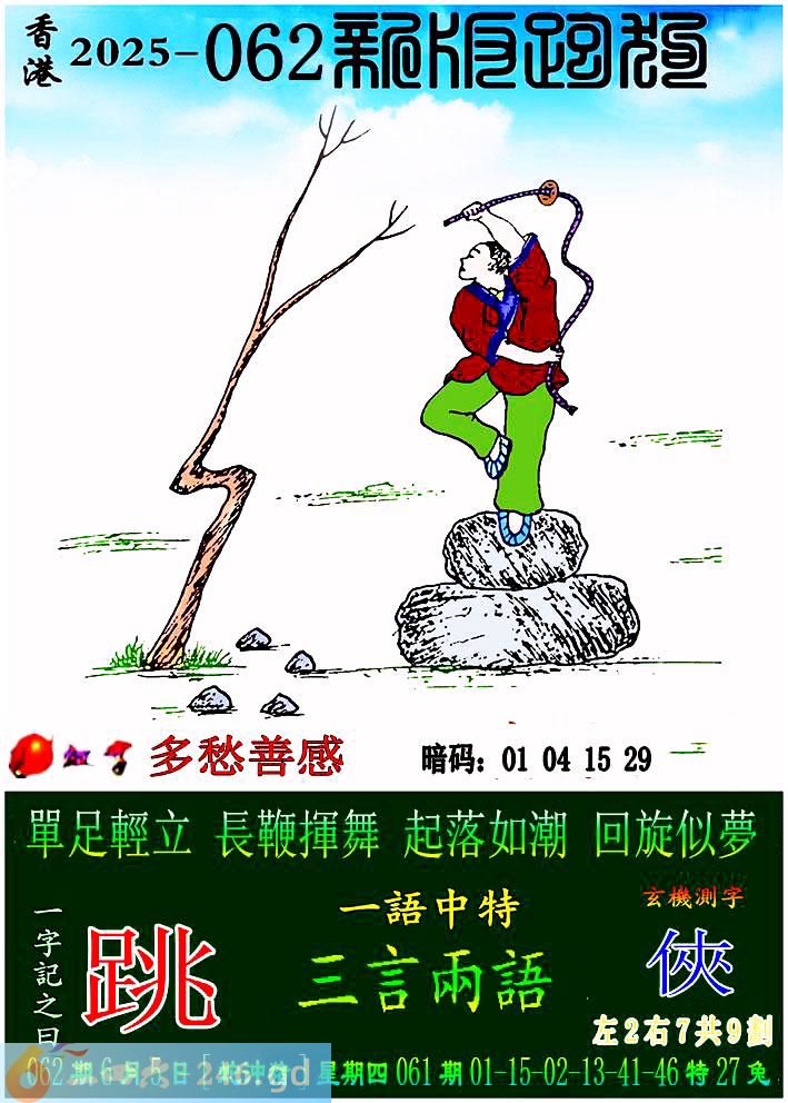 062期跑狗一字記之曰:【舞】 單足輕立,長鞭揮舞。 起落如潮,回旋似夢。 玄機測字:《俠》 一語中特:三言兩語