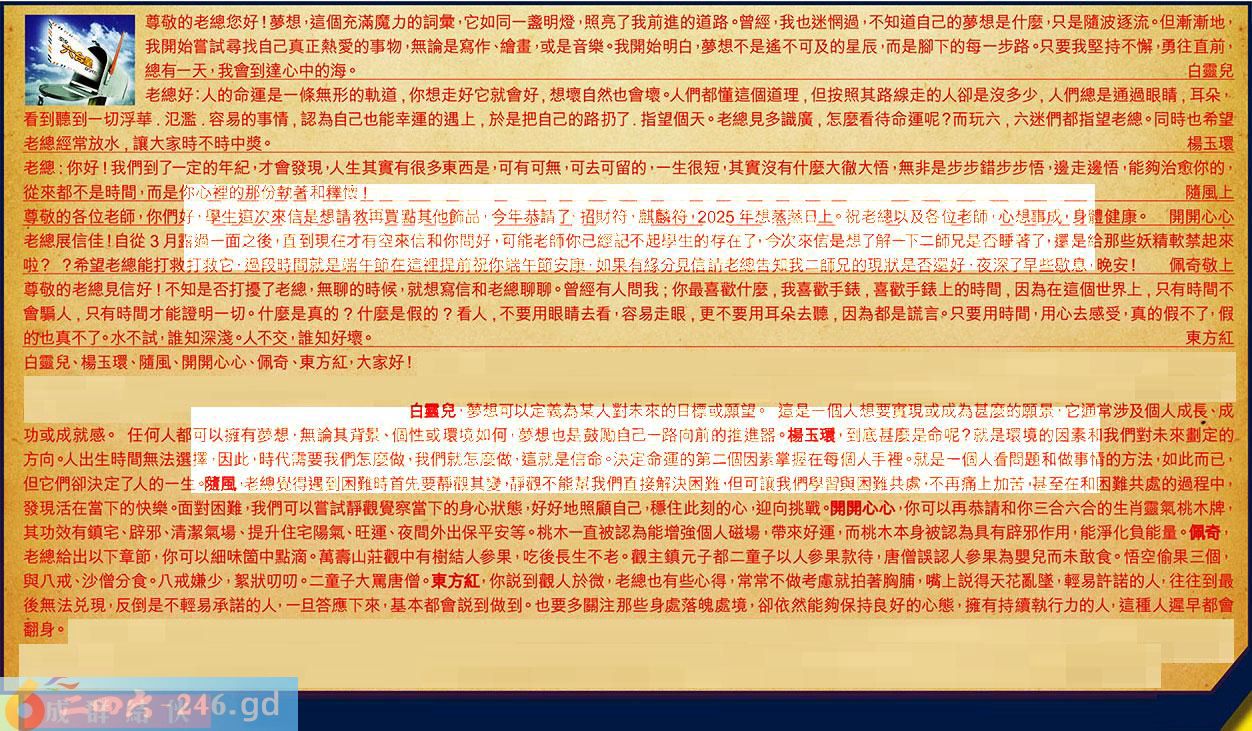 第064期《六合皇信箱文字版》10000%正確!!!正版二四六論壇*精心製作!!! 白靈兒、楊玉環、隨風、開開心心、佩奇、東方紅,大家好! 【1】.尊敬的老總您好!夢想,這個充滿魔力的詞彙,它如同一盞明燈,照亮了我前進的道路。曾經,我也迷惘過,不知道自己的夢想是什麼,只是隨波逐流。但漸漸地,我開始嘗試尋找自己真正熱愛的事物,無論是寫作、繪畫,或是音樂。我開始明白,夢想不是遙不可及的星辰,而是腳下的每一步路。只要我堅持不懈,勇往直前,總有一天,我會到達心中的海。白靈兒 〖白靈兒〗:夢想可以定義為某人對未來的目標或願望。這是一個人想要實現或成為基麼的願景,它通常涉及個人成長、成功或成就感。任何人都可以擁有夢想,無論其背景、個性或環境如何,夢想也是鼓勵自己一路向前的推進器。 【2】.老總好:人的命運是一條無形的軌道,你想走好它就會好,想壞自然也會壞。人們都懂這個道理,但按照其路線走的人卻是沒多少,人們總是通過眼睛,耳朵,看到聽到一切浮華.汜濫.容易的事情,認為自己也能幸運的遇上,於是把自己的路扔了.指望個天。老總見多識廣,怎麼看待命運呢?而玩六,六迷們都指望老總。同時也希望老總經常放水,讓大家時不時中獎。楊玉環 〖楊玉環〗:到底甚麼是命呢?就是環境的因素和我們對未來劃定的方向。人出生時間無法選擇,因此,時代需要我們怎麼做,我們就怎麼做,這就是信命。決定命運的第二個因素掌握在每個人手裡。就是一個人看問題和做事情的方法,如此而已,但它們卻決定了人的一生。 【3】.老總:你好!我們到了一定的年紀,才會發現,人生其實有很多東西是,可有可無,可去可留的,一生很短,其實沒有什麼大徹大悟,無非是步步錯步步悟,邊走邊悟,能夠治愈你的,從來都不是時間,而是你心裡的那份執著和釋懷!隨風上 〖隨風〗:老總覺得遇到困難時首先要靜觀其變,靜觀不能幫我們直接解決困難,但可讓我們學習與困難共處,不再痛上加苦甚至在和困難共處的過程中,發現活在當下的快樂。面對困難,我們可以嘗試靜觀覺察當下的身心狀態,好好地照顧自己,穩住此刻的心,迎向挑戰。 【4】.尊敬的各位老師,你們好,學生追次來信是想請教再買點其他飾品,今年恭請了,招财符,麒麟符,2025年想蒸蒸日上。祝老總以及各位老師,心想事成身體健康。開開心心 〖開開心心〗:你可以再恭請和你三合六合的生肖靈氣桃木牌,其功效有鎮宅、辟邪、清潔氣場、提升住宅陽氣、旺運、夜間外出保平安等。桃木一直被認為能增強個人磁場,帶來好運,而桃木本身被認為具有辟邪作用,能淨化負能量。 【5】.老總展信佳!自從3月露過一面之後,直到現在才有空來信和你問好,可能老師你已經記不起學生的存在了,今次來信是想了解下二師兄是否睡著了,還是給那些妖精軟禁起來啦??希望老總能打救打救它,過段時間就是端午節在這裡提前祝你端午節安康,如果有緣分見信請老總告知我二師兄的現狀是否還好,夜深了早些歇息,晚安!佩奇 〖佩奇〗:老總給出以下章節,你可以細味筒中點滴。萬壽山莊觀中有樹結人參果,吃後長生不老。觀主鎮元子都二童子以人參果款待,唐僧誤認人參果為婴兒而未敢食。悟空偷果三個,與八戒、沙僧分食。八戒嫌少,絮狀叨叨。二童子大罵唐僧。 【6】.敬上尊敬的老總見信好!不知是否打擾了老總,無聊的時候,就想寫信和老總聊聊。曾經有人問我;你最喜歡什麼,我喜歡手錶,喜歡手錶上的時間,因為在這個世界上,只有時間不會騙人,只有時間才能證明一切。什麼是真的?什麼是假的?看人,不要用眼睛去看,容易走眼,更不要用耳朵去聽,因為都是謊言。只要用時間,用心去感受,真的假不了,假的也真不了。水不試,誰知深淺。人不交,誰知好壞。東方紅 〖東方紅〗:你說到觀人於微,老總也有些心得,常常不做考慮就拍著胸脯,嘴上說得天花亂墜,輕易許諾的人,往往到最後無法兑現,反倒是不輕易承諾的人,一旦答應下來,基本都會說到做到。也要多關注那些身處落魄處境,卻依然能夠保持良好的心態,擁有持續執行力的人,這種人遲早都會翻身。 紅字:成群結伙 暗码:12161926 [释义]众多人物聚集在一起。 [出处]清·文康《儿女英雄传》第三十二回:“料着安老爷家办过喜事,一定人人歇乏,不加防范,便成群结伙而来,想要下手。”