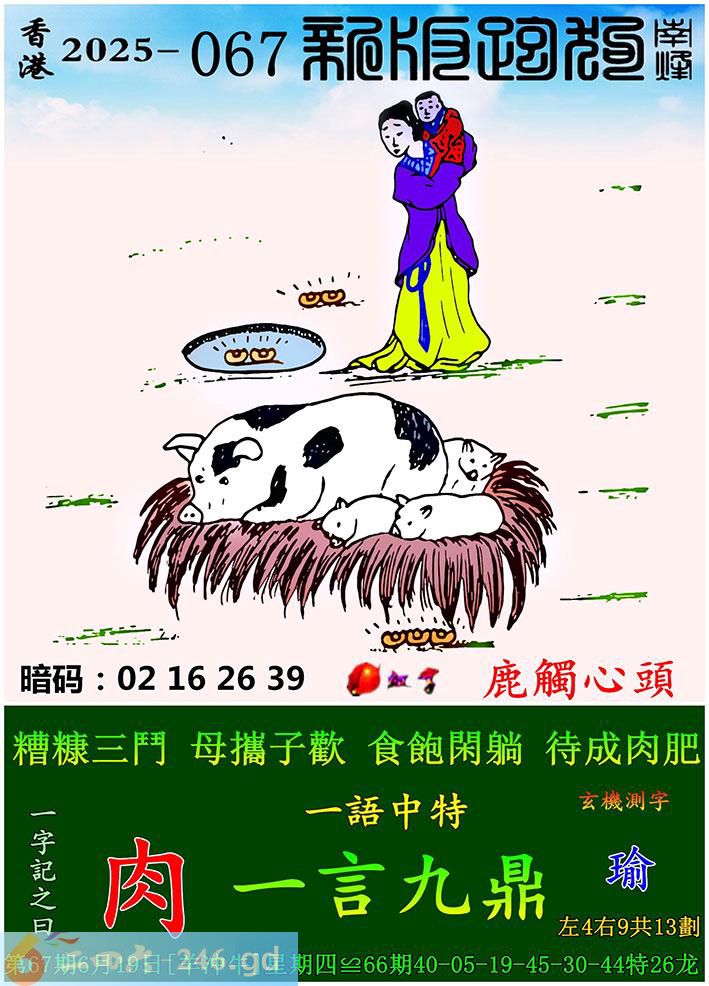 067期跑狗一字記之曰:【肉】 糟糠三鬥,母攜子歡。 食飽閑躺,待成肉肥。 玄機測字:《瑜》 一語中特:一言九鼎