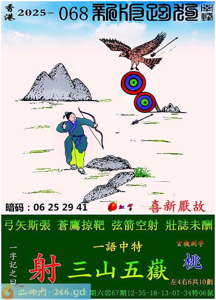 068期跑狗一字記之曰:【射】 弓矢斯張,蒼鷹掠靶。 弦箭空射,壯誌未酬。 玄機測字:《桃》 一語中特:三山五嶽
