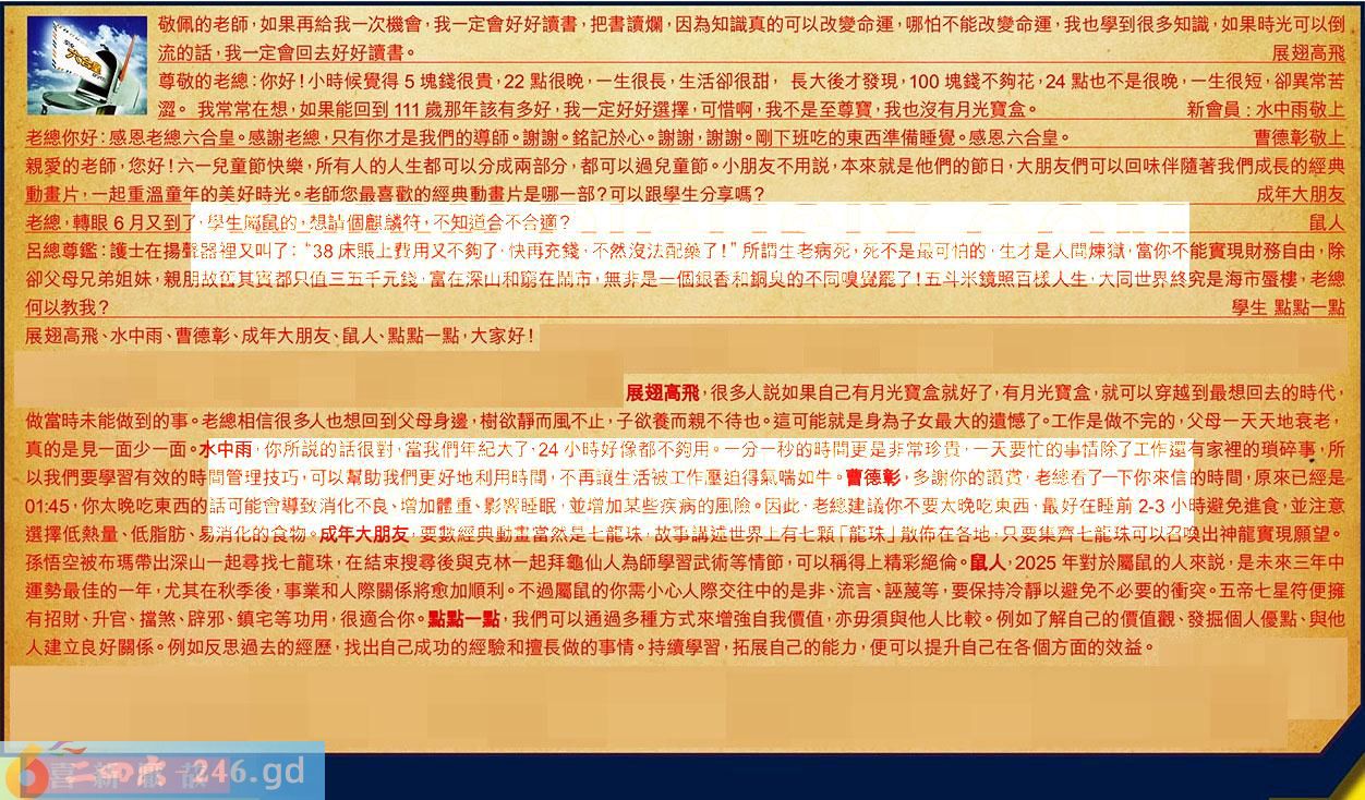 第068期《六合皇信箱文字版》10000%正確!!!正版二四六論壇*精心製作!!! 展翅高飛、水中雨、曹德彰、成年大朋友、鼠人、點點一點,大家好! 【1】.敬佩的老師,如果再給我次機會,我一定會好好讀書,把書讀爛,因為知識真的可以改變命運,哪怕不能改變命運,我也學到很多知識,如果時光可以倒流的話,我一定會回去好好讀書。展翅高飛 〖展翅高飛〗:很多人說如果自己有月光寶盒就好了,有月光寶盒,就可以穿越到最想回去的時代,做當時未能做到的事。老總相信很多人也想回到父母身邊,樹欲靜而風不止,子欲養而親不待也。這可能就是身為子女最大的遺憾了。工作是做不完的,父母一天天地衰老,真的是見一面少一面。 【2】.尊敬的老總:你好!小時候覺得5塊錢很貴,22點很晚,一生很長,生活卻很甜,長大後才發現,100塊錢不夠花,24點也不是很晚,一生很短,卻異常苦澀。我常常在想;如果能回到111歲那年該有多好,我一定好好選擇,可惜啊,我不是至尊寶,我也沒有月光寶盒。新會員:水中雨敬上 〖水中雨〗:你所說的話很對,當我們年紀大了,24小時好像都不夠用。一分一秒的時間更是非常珍貴,一天要忙的事情除了工作還有家裡的瑣碎事,所以我們要學習有效的時間管理技巧,可以幫助我們更好地利用時間,不再讓生活被工作壓迫得氣喘如牛。 【3】.老總你好:感恩老總六合皇。感謝老總,只有你才是我們的導師。謝謝。銘記於心。謝謝,謝謝。剛下班吃的東西準備睡覺。感恩六合皇。曹德彰敬上 〖曹德彰〗:多謝你的讚賞,老總看了一下你來信的時間,原來已經是01:45,你太晚吃東西的話可能會導致消化不良、增加體重、影響睡眠,並增加某些疾病的風險。因此,老總建議你不要太晚吃東西,最好在睡前2-3小時避免進食,並注意選擇低熱量、低脂肪、易消化的食物。 【4】.親愛的老師,您好!六一兒童節快樂,所有人的人生都可以分成兩部分,都可以過兒童節。小朋友不用說,本來就是他們的節日,大朋友們可以回味伴隨著我們成長的經典動畫片,一起重溫童年的美好時光。老師您最喜歡的經典動畫片是哪一部?可以跟學生分享嗎?成年大朋友 〖成年大朋友〗:要數經典動盡當然是七龍珠,故事講述世界上有七顆「龍珠」散饰在各地,只要集齊七龍珠可以召喚出神龍實現願望。孫悟空被布瑪帶出深山一起尋找七龍珠,在結束搜尋後與克林一起拜龜仙人為師學習武術等情節,可以稱得上精彩絕倫。 【5】.老總:轉眼6月又到了,學生屬鼠的,想請個麒麟符不知道合不合適?鼠人 〖鼠人〗:2025年對於屬鼠的人來說,是未來三年中運勢最佳的一年,尤其在秋季後,事業和人際關係將愈加順利。不過屬鼠的你需小心人際交往中的是非、流言、誣蔑等,要保持冷靜以避免不必要的衝突。五帝七星符便擁有招財、升官、擋煞、辟邪、鎮宅等功用,很適合你。 【6】.呂總尊鑑:護士在揚聲器裡又叫了:“38床賬上费用又不夠了,快再充錢,不然沒法配藥了!”所謂生老病死,死不是最可怕的,生才是人間煉獄,當你不能實現財務自由,除卻父母兄弟姐妹,親朋故舊其實都只值三五千元錢,富在深山和窮在鬧市,無非是一個銀香和銅臭的不同嗅覺罷了!五斗米鏡照百樣人生,大同世界終究是海市蜃樓,老總何以教我?學生點點一點 〖點點一點〗:我們可以通過多種方式來增強自我價值,亦毋須與他人比較。例如了解自己的價值觀、發掘個人優點、與他人建立良好關係。例如反思過去的經歷,找出自己成功的經驗和擅長做的事情。持續學習,拓展自己的能力,便可以提升自己在各個方面的效益。 紅字:喜新厭故 暗码:06252941 [释义]喜欢新的,厌弃旧的。多指爱情不专一。 [出处]《林泉高致·山水训》。