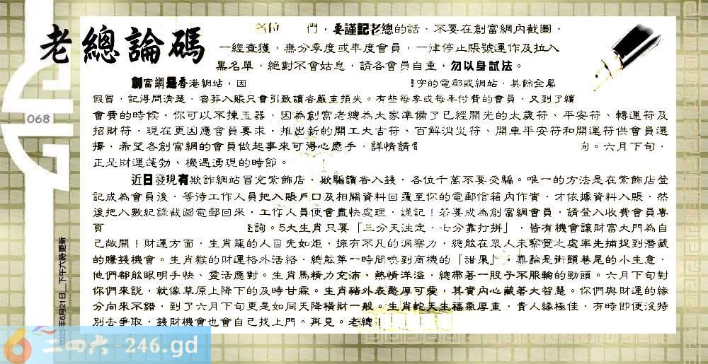 068期:六合皇金句/老总论码/萧公子/林大师/五行夺码/老总信箱截图