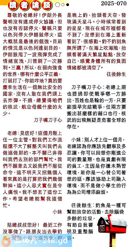第零七零期讀者論談 1.尊敬的老總好!伊朗外長聲明沒有達成停火協議,但也沒有否認停火,聲稱只要以色列停火伊朗就停火,這大概就是最後的倔強。目前的情況是以色列達到目的伊朗狠甩了一波飛彈完成了情緒宣洩,川普刷了一次勝利。三赢!所以,在弱肉強食的世界,哪有什麼公平正義,打就打了,你能咋地?真的要慶幸生活在個無比安全的國家,沒有人敢在我們頭上丢炸彈。不過,總覺得咱們的核武、航空母艦什麼的太少。刀子嘴刀子心 〖刀子嘴刀子心〗:老總上期也提過即使戰爭哪一方勝出,百姓也是輸的一方,只要能提早完結戰爭,任兩方要搬出甚麼樣的藉口也行,核武的出現無疑是危害全球的存在。 2.老總:見信好!這個月剛上任一位主管。對我們工作流程還不大了解整天叫我們去做這做那的,本不關己非得叫我們去別的部門幫忙。我們不願意去又说我們不服從命令,這不明天又招幾個人看來真的是打算把我們幾個幹掉。這小人惡犬實在是令人痛恨。我不想丟了這份工作。希望老總能幫我這個忙。小妹 〖小妹〗:別人才上位一個月,老總認為你應該先觀察及多忍讓,你可以回想你剛進公司的數星期,也是貢獻有限的員工,主因是你還未熟習環境,若你是一心替公司著想的話,應該協助上司融入環境,而不是做小學生的行為為公司增添麻煩。 3.貼總叔叔您好!最近工作沒事做了,跟朋友出去學釣魚。開個小船出海釣魚,都是晚上釣,抬頭看天空,發現滿天星斗。小時候常看到的星星,現在在城市裡都看不到了,沒想到在海上重新看到了,很感動。釣不釣到魚無所謂了,在海上吹海風,抬頭看著滿天繁星點點,放空自己,感覺身體所有的負面情緒都被清空了。往後餘生 〖往後餘生〗:釣魚是一種可幫助放空的活動,去除腦袋多餘的垃圾,有助自我審視及重整腦袋。