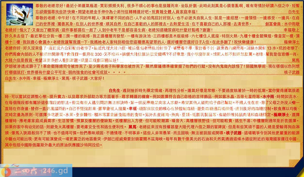 第073期《六合皇信箱文字版》10000%正確!!!正版二四六論壇*精心製作!!! 白先生、水中雨、幸福、極樂淨土、黑馬、核子武器,大家好! 【1】.尊敬的老總您好!最近小弟運氣極差,買彩頻頻失利,很多不順心的事也是接踵而來,坐臥針氈,此時此刻真是心煩意亂啊,唯有寄情於研讀六信之中,短暫忘卻煩惱尋找些許快樂。期望老總金手伸中為小弟刊信轉轉運好吧。祝貴報全體人員家庭幸福!白先生 〖白先生〗:遇到挫折時先穩定情緒,再理性分析。運氣好壞是常態,不要過度執著於一時的低潮。當你覺得運氣很差時,可以嘗試從調整心態、提升實力、以及尋求外部助力等方面著手,尋求轉運的機會。例如選擇符合自己命格的吉祥飾品,例如紫水晶、五帝七星符等。 【2】.尊敬的老總:中午好!在不同的年輕人,演繹蓍不同的自己,人不必拍馬屁討好別人,也不必迷失自我人生,就是一邊經歷,一邊領悟,一邊感受,一邊共,在自己的世界裡,獨善其身,在别人的世界裡,順其自然,在自己喜歡的人的那裡去。去熱爱生活,在不喜歡自己的人那裡,去清世界。創富會員:水中雨敬 〖水中雨〗:時間如流水,在每個階段都有屬於這個階段的想法。但是有些人遇到問題無法解決時,第一個反應總是向家人求助。希望其他人能夠給予自己幫助。不過人生在世,除了父母之外沒人會一直陪在你身邊,替你一直遮風擋雨的。自己不堅強起來,遲早會被人拋棄。 【3】.老總好!惱火了,又查出了糖尿病,這件事都搞在一起了,人到中老年不是都容易生病,老總知道糖尿病吃什麼好點嗎?謝謝!幸福敬上 〖幸福〗:糖尿病飲食的核心在於控制血糖,避免血糖過高或過低,達到良好的血糖控制。飲食應以均衡、定時定量為原則,可選擇多吃蔬菜、水果、全麥麺包、糙米等富含膳食纖維的食物。另外去皮雞肉、魚肉、豆類、低脂乳製品等,有助於維持肌肉量和血糖穩定。 【4】.許久未去信了,最近單位分我一樓二房一樓的裝修,我正選樓層而發愁,一樓有游泳池,三四樓都是木版裝修,六七樓住人底座,特別火熱,九樓十樓金碧輝煌,像皇宮一樣,頂樓十二樓,我說擔心會漏水。老總我讓幫我選下,我媽她老人家特別相信您這種德高望眾的人,選好樓層您選好日子入住。在此多謝了!祝快樂健康!極樂淨土 〖極樂淨土〗:選擇樓層時,應考慮家庭成員需求、生活習慣、預算及樓層的優缺點。低樓層出入方便,但可能較潮濕、噪音大;高樓層視野佳,但可能較貴、逃生不易;中樓層則通常是折衷選擇。如果你家中有幼兒的話,則避免太高樓層要考慮安全性和逃生便利性。 【5】.老總你好,好久沒來信了,最近玩六合彩輸的老慘了,最近代理大陸六信,被這個假老總坑的好惨了,單雙看不準,家野看不到,說東西肖開南肖。說缺水開蛇13水。坑的老惨了,你們馬會內部的人不能把他開除嗎?會員费一個月收300又不給料。這個大陸信就這麼愛錢嗎?不好意思,我小學沒畢業。想罵人都不知道怎麼罵。老總,幫我登信宣傳一肖大陸六信是假貨,希望讓更多的人看到謝謝。還是正版創富網最好!黑馬 〖黑馬〗:老總從來沒有授權甚麼大陸代理六信之類的冒牌貨,但是有些冥頑不靈的人總是愛輸得狗血淋頭、像馬入狹路般回不了頭,也不值得可憐。他們愚昧頑固,不通情理,不明事非。這些人非常愚笨,而且固執,無法被說服或開導。 【6】.伊朗被滲透成篩子了!革命衛隊總司令被炸死了,至少兩名核子科學家也被炸死了,顯然摩薩德準確掌握了他們的行蹤。沒有內鬼做內該怪了!弱國無學術,現在哪個以色列想打哪個就打,世界哪有什麼公平可言,弱肉強食的社會可成就。。。。。核子武器 〖核子武器〗:這場戰爭令到其他更嚴重的能源中斷也可能出現,更有可能演變成一場更廣泛的地區衝突,伊朗已經威脅要封鎖霍爾木茲海峽。每年有數千億美元的石油和天然氣通過這條水道從附近的海灣國家運往中國,其中包括中國除俄羅斯外最大的原油供應國沙特阿拉伯。 紅字:秉燭待旦 暗码:11193447 [释义]手持点燃的蜡烛待天亮。 [出处]元·马致远《陈抟高卧》第四折:“好个古撇先生,还是那壁披衣据床,秉烛待旦哩!”