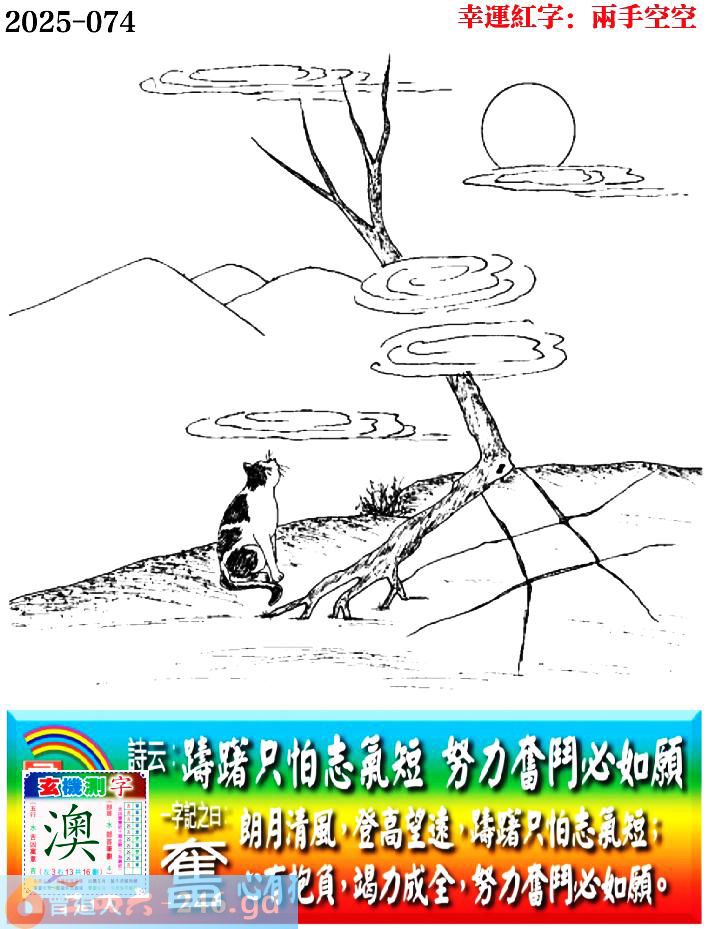 074期老版跑狗一字記之曰:【奮】 詩雲:躊躇只怕志氣短,努力奮鬥必如願。 朗月清風,登高望遠,躊躇只怕志氣短; 心有抱負,竭力成全,努力奮鬥必如願。 玄機測字:《澳》