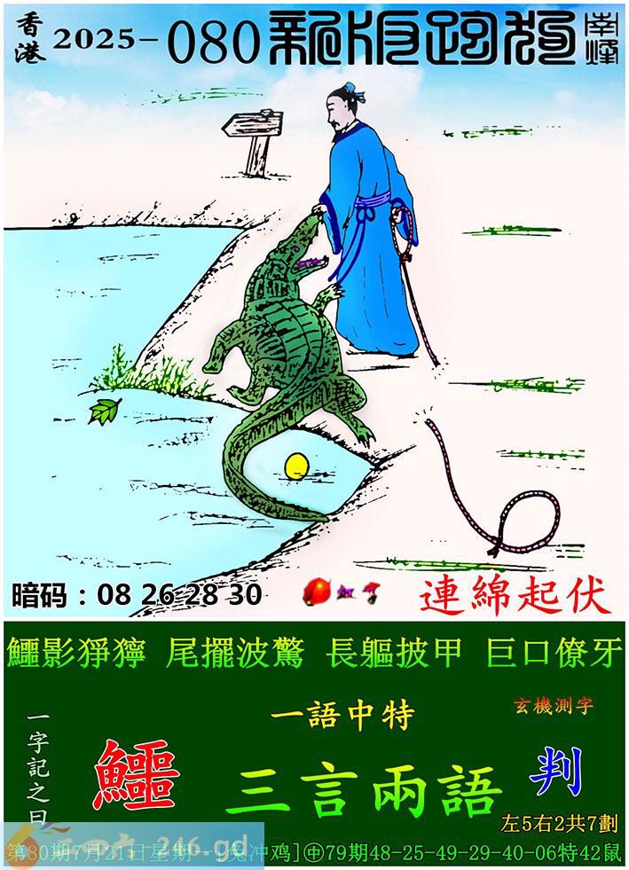 080期跑狗一字記之曰:【鱷】 鱷影猙獰,尾擺波驚。 長軀披甲,巨口僚牙。 玄機測字:《判》 一語中特:三言兩語