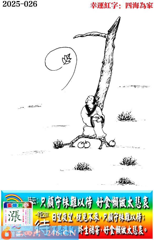026期老版跑狗一字記之曰:【待】 詩雲:只顧守株難以待,好食懶做太悲哀。 日望夜望,脱兔不來,只顧守株難以待 不思進取,終生禍害,好食懶做太悲哀。 玄機測字:《漲》