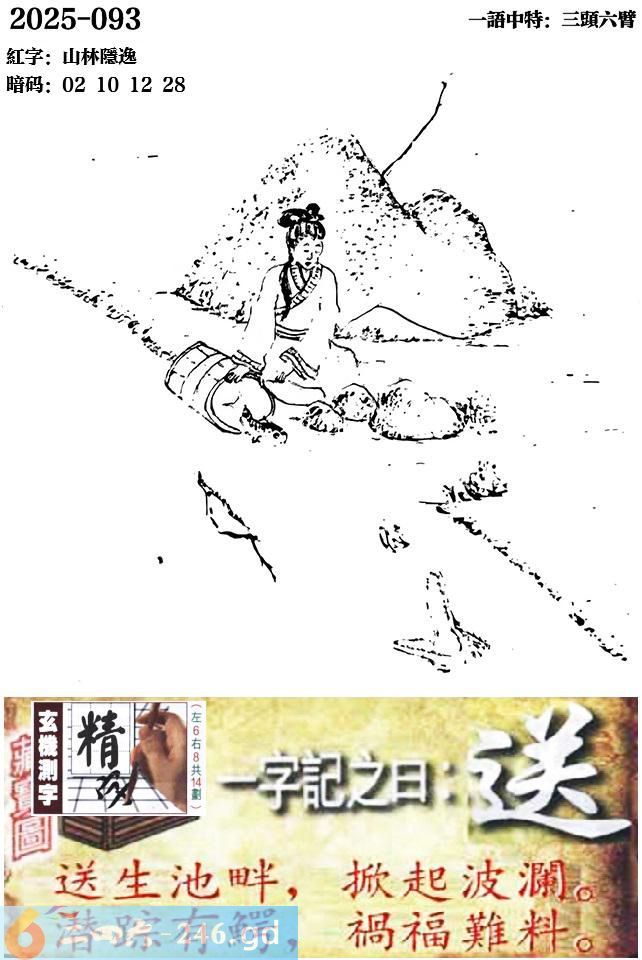 093期跑狗一字記之曰:【送】 送生池畔,掀起波瀾。 潛蹤有鱷,禍福難料。 玄機測字:《精》 一語中特:三頭六臂