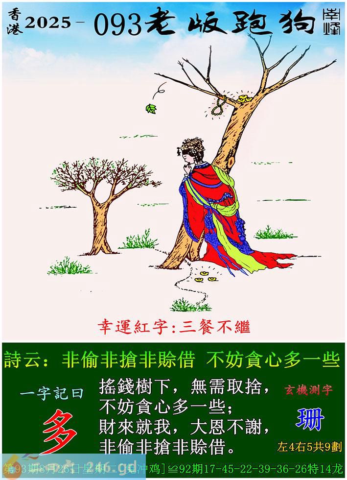093期老版跑狗一字記之曰:【多】 詩雲:非偷非搶非賒借,不妨貪心多一些。 搖錢樹下,無需取捨,不妨貪心多一些; 財來就我,大恩不謝,非偷非搶非賒借。 玄機測字:《珊》