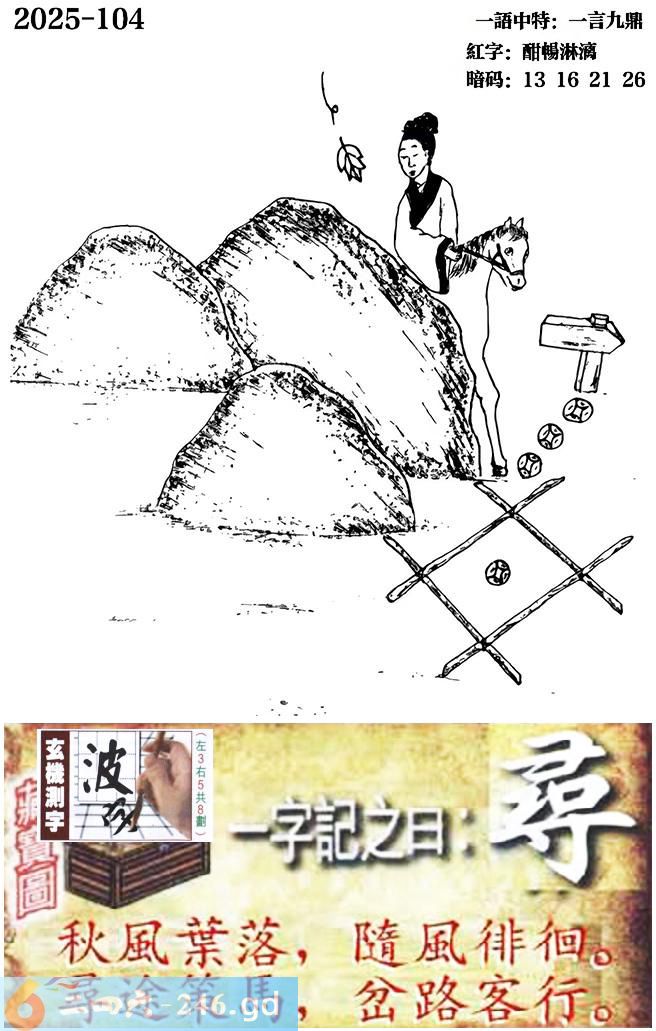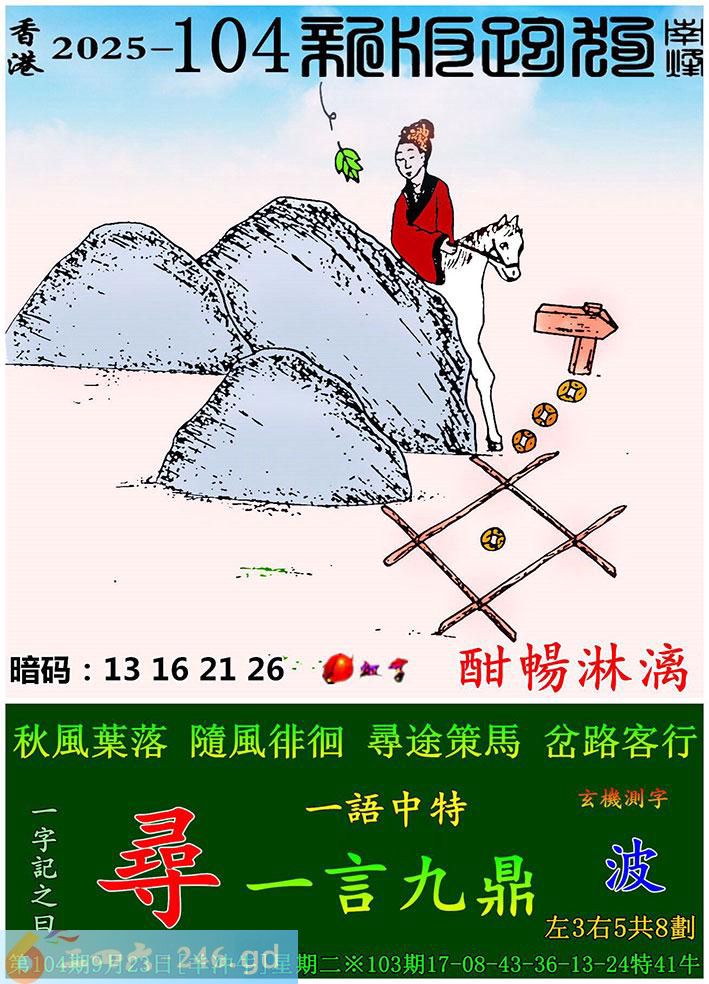 104期跑狗一字記之曰:【尋】 秋風葉落,隨風徘徊。 尋途策馬,岔路客行。 玄機測字:《波》 一語中特:一言九鼎