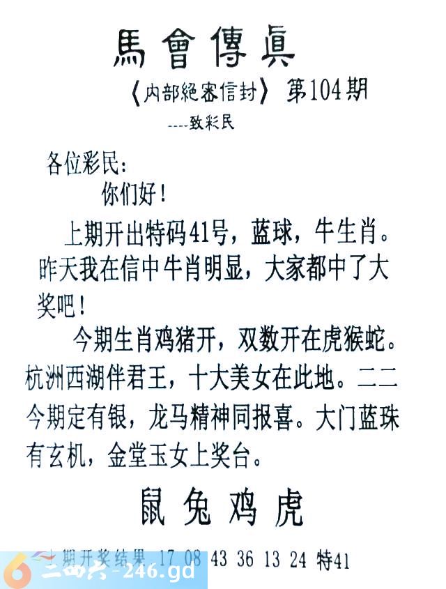 104期:首发推荐:≮馬會傳眞≯→(香港正版)