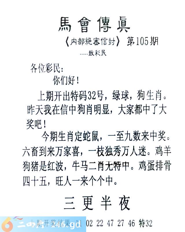 105期:首发推荐:≮馬會傳眞≯→(香港正版)