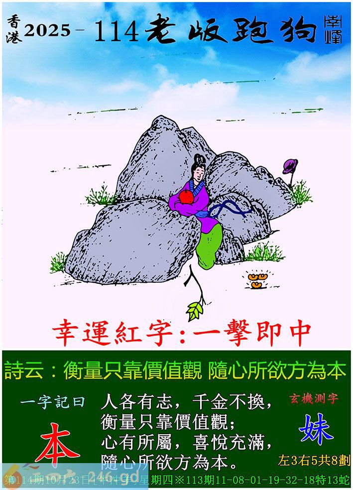114期老版跑狗一字記之曰:【本】 詩雲:衡量只靠價值觀,隨心所欲方為本。 人各有志,千金不換,衡量只靠價值觀; 心有所屬,喜悅充滿,隨心所欲方為本。 玄機測字:《妹》