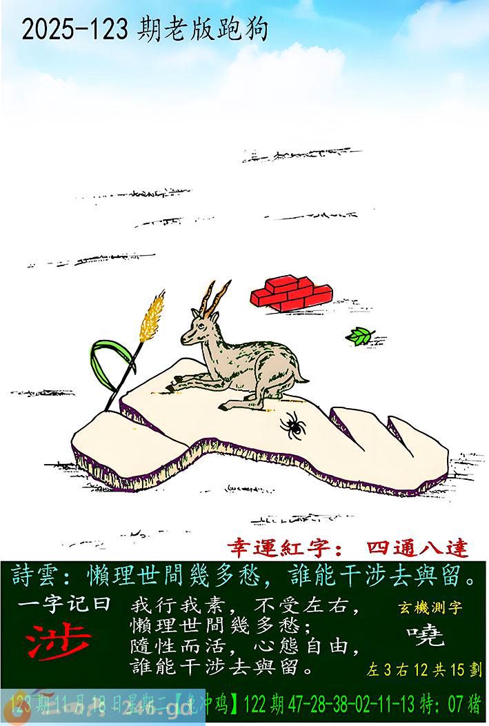123期老版跑狗一字記之曰:【涉】 詩雲:懶理世間幾多愁,誰能干涉去與留。 我行我素,不受左右,懶理世間幾多愁; 隨性而活,心態自由,誰能干涉去與留。 玄機測字:《嘵》