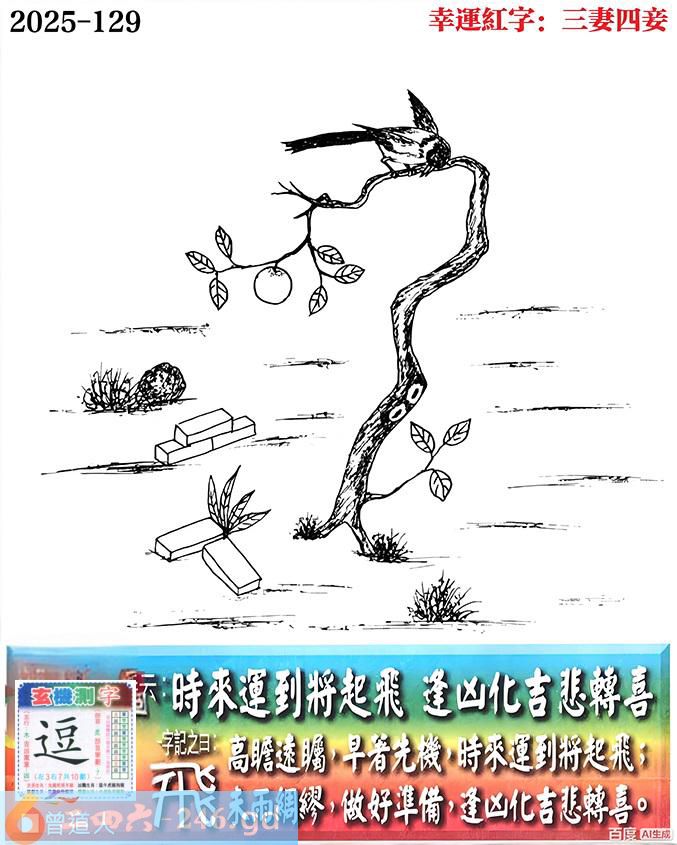 129期老版跑狗一字記之曰:【飛】 詩雲:時來運到將起飛,逢凶化吉悲轉喜。
