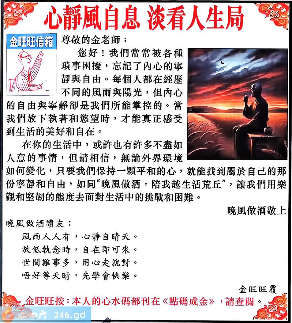 130期:金旺旺信箱彩民推荐→→《心靜風自息 淡看人生局》