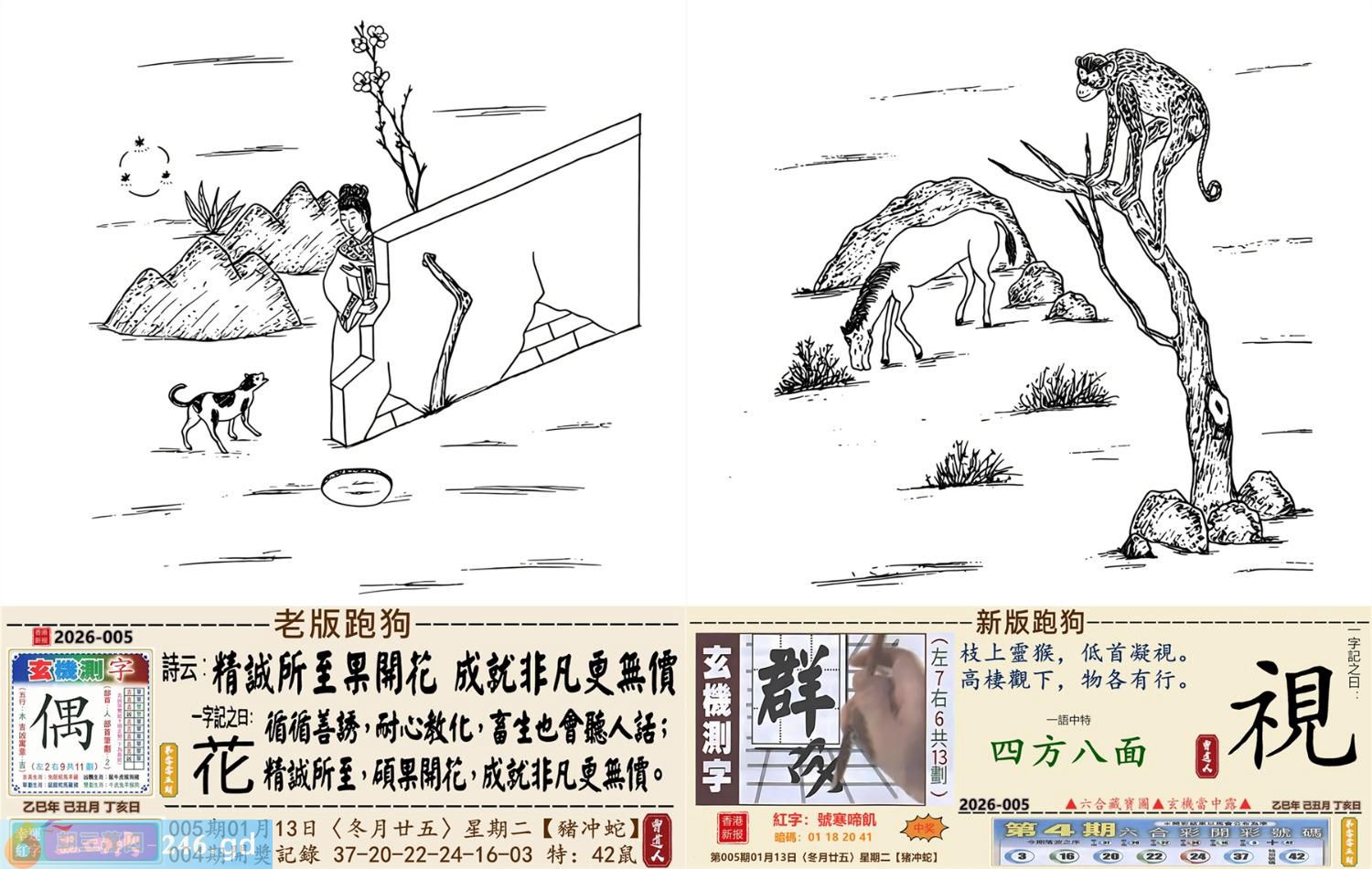 2026年1月13日005期蛇(辛巳)(屋上土) 005期:老版跑狗玄機一字記之曰:【花】 詩云:精誠所至果開花成就非凡更無價 循循善誘,耐心教化,畜生也會聽人話; 精誠所至,碩果開花,成就非凡更無價。 玄機測字:《偶》 密圖詩:打開大門迎財神 《記》:八仙過海顯蛇兔 特碼大小單雙句:天涯海角 今期必中:劉協 005期:特碼歇后語 砍了头的竹子-----节外生枝 005期正版四字梅花诗:春秋战国。 005期火车头:烧伤鸡。诗:龙死猪伤,三八连理必二十。 005期香港第一手欲钱料:金? 005期曾道人说:“四?” 005期另版四字梅花诗:马会天子。 005期香港第一手欲钱料:欲钱看大家身边最亲近的动物。 005期曾道人说:“女人三十后为什么上厕所不关门”? 005期:二字經:京城 005期:电灯是特码 005期:智力金壤;飞蛾扑火 005期:信箱紅字:【號寒啼飢】 005期:【暗碼:01-18-20-41】 005期:一語中特:【四方八面】 發財玄機圖:毛皮雪白墨守成規圖中明兔紅綠 005期:藏寳圖 新:倚阁尘消玉树空 老:郑虔自笑穷耽酒 禁:蛇禁:8尾玄機字《滋》 2026年005期【生活幽默】版 〖乞討〗 一個乞丐來到一個吝嗇鬼家門前乞討。乞丐:"請給一小塊肥肉,乳酪或奶油。" 吝嗇鬼:"没有呀!"乞丐:"面包屑也行。"吝嗇鬼:"也没有。" 乞丐:"那就给口水喝吧!" 吝嗇鬼:"我們連水也没有了。" 乞丐發怒了:"那你爲什還坐在家裏?快跟我一起要飯去!"