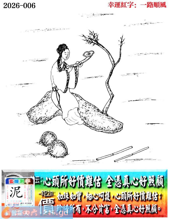 006期老版跑狗一字記之曰:【價】 詩雲:心頭所好價難估,全憑真心好照顧。 如珠如寶,細心呵護,心頭所好價難估; 珍惜所有,不分貧富,全憑真心好照顧。 玄機測字:《泥》