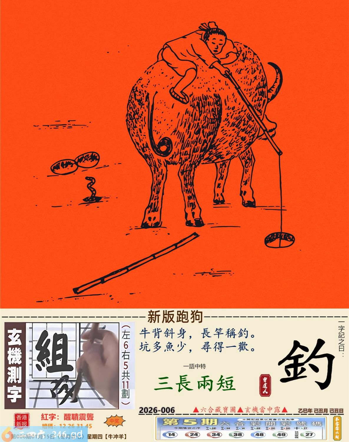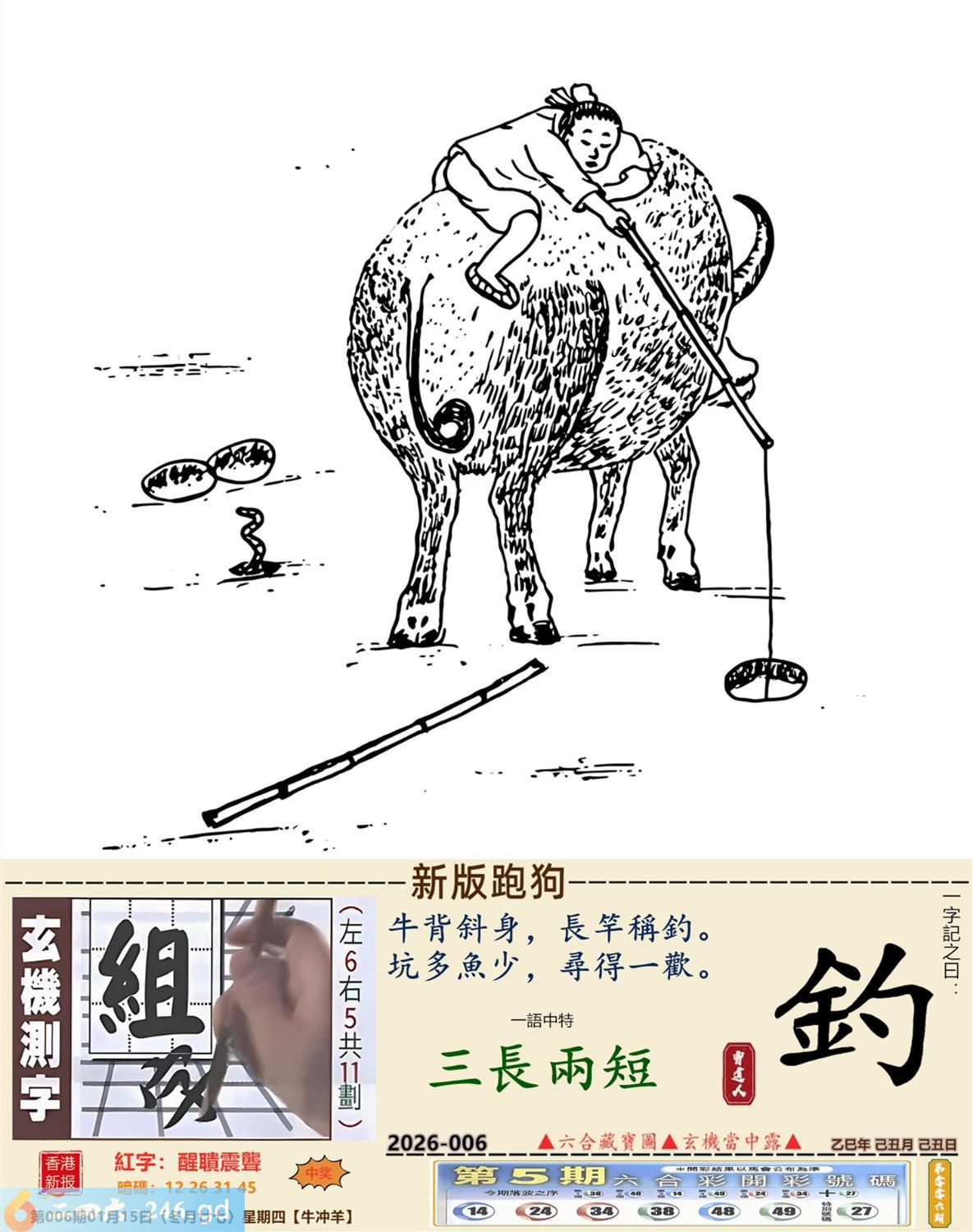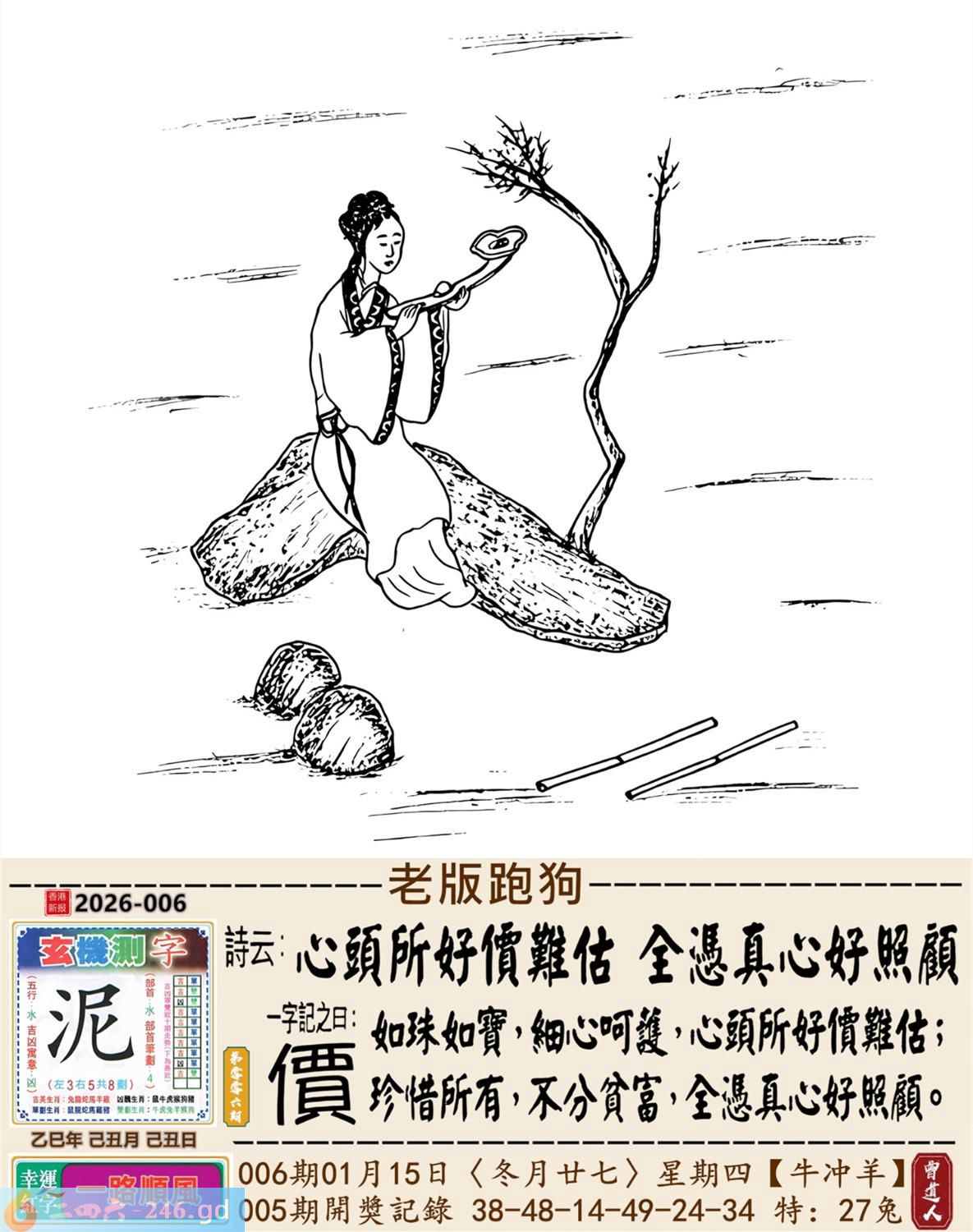 2026年1月15日006期羊(癸未)(霹雷火) 006期:老版跑狗玄機一字記之曰:【價】 詩云:心頭所好價難估全憑真心好照顧 如珠如寶,細心呵護,心頭所好價難估: 珍惜所有,不分貧富,全憑真心好照顧。 玄機測字:《泥》 密圖詩:有七有八出紅波 《記》:來回三局敗一地 特碼大小單雙句:非驢非馬 今期必中:趙雲 006期:特碼歇后語 锯子锯掉烂木头-----摧枯拉 006期正版四字梅花诗:势不可当。 006期火车头:烧伤牛。诗:虎死兔伤,十二合一特码出。 006期香港第一手欲钱料:石头? 006期曾道人说:“龙?” 006期另版四字梅花诗:西施特码。 006期香港第一手欲钱料:欲钱看一九九八同期的开奖结果。 006期曾道人说:“为什么地球会转”? 006期:二字經:七八 006期:井底有特码 006期:智力金壤;张灯结彩 006期:信箱紅字:【醒聵震聾】 006期:【暗碼:12-26-31-45】 006期:一語中特:【三長兩短】 發財玄機圖:憨頭憨腦可愛懶惰圖中明豬藍綠 006期:藏寳圖 新:欲往宁辞沔水深 老:水鸡衔鱼来去飞 禁:猴禁:4尾玄机字《样》 2026年006期【生活幽默】版 〖什么東西〗 公交車,不讓乘客帶寵物和動物上車。 一個老太太把一活公鷄装到布兜子裹,帶上了車!車上能有20多人,老太太剛找到座位坐好,公把頭伸了出來,打了一個清脆的鳴!把司機嚇了一跳,車上的乘客都知道是怎回事,司機:什東西?老太太迅速把鷄頭按回袋子裹,説了一聲:是手機鈴聲!