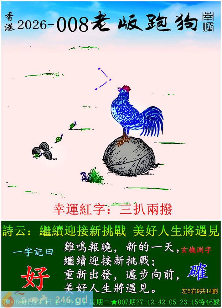 008期老版跑狗一字記之曰:【好】 詩雲:繼續迎接新挑戰,美好人生將遇見。 雞鳴報曉,新的一天,繼續迎接新挑戰; 重新出發,邁步向前,美好人生將遇見。 玄機測字:《確》