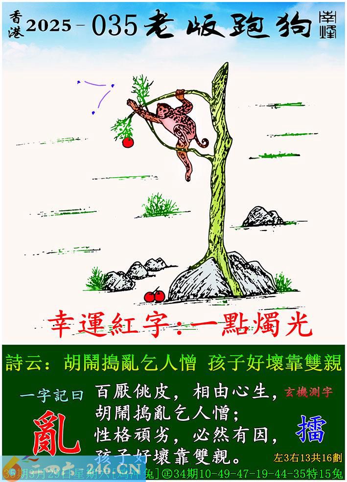 035期老版跑狗一字記之曰:【亂】 詩雲:胡鬧搗亂乞人憎,孩子好壞靠雙親。 百厭佻皮,相由心生,胡鬧搗亂乞人憎; 性格頑劣,必然有因,孩子好壞靠雙親。 玄機測字:《擂》