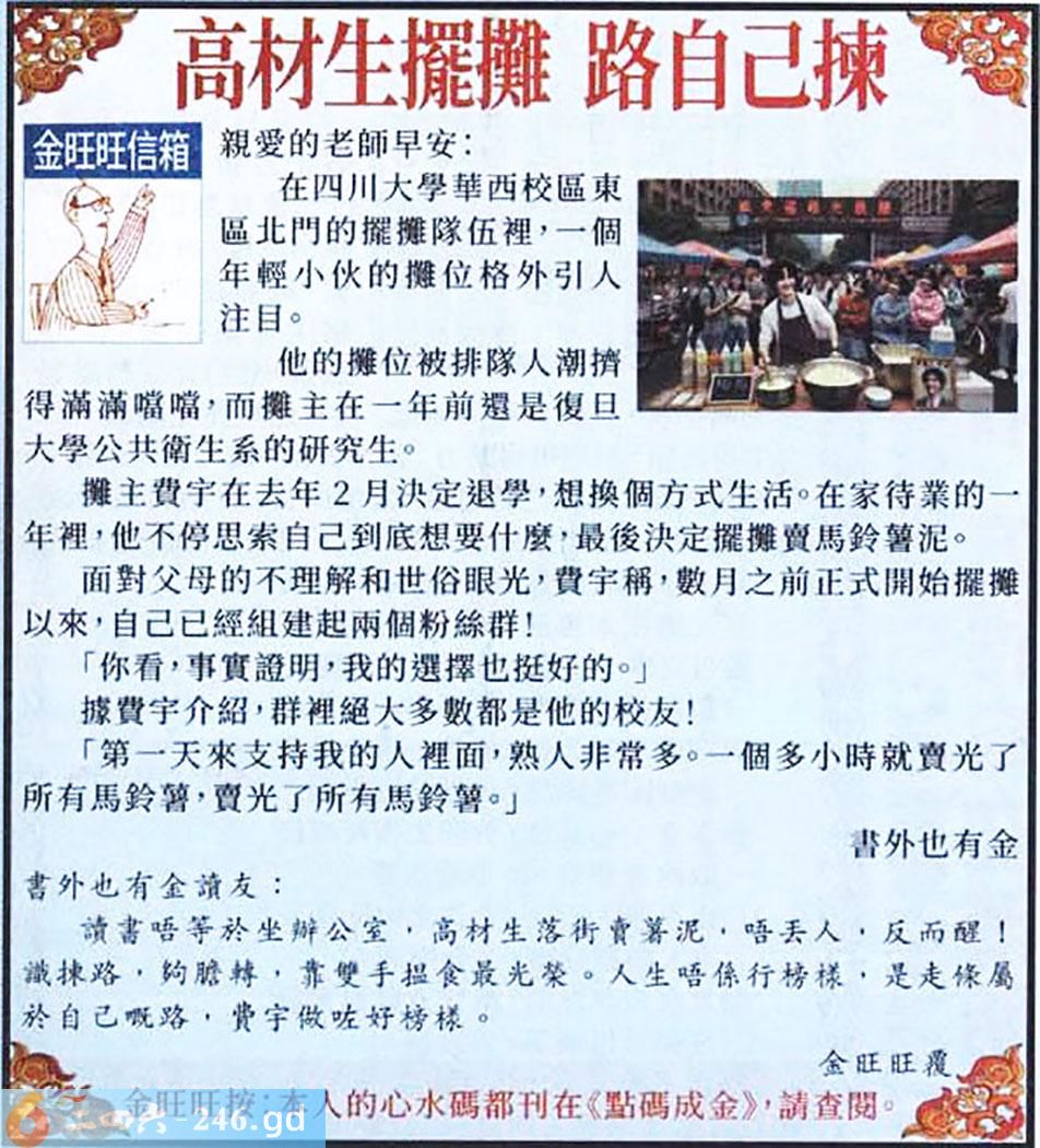 020期:金旺旺信箱彩民推荐→→《高材生擺攤 路自己揀》