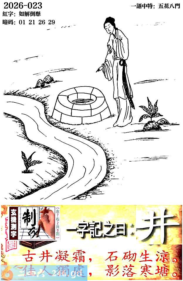 023期跑狗一字記之曰:【井】 古井凝霜,石砌生涼。 佳人獨處,影落寒塘。
