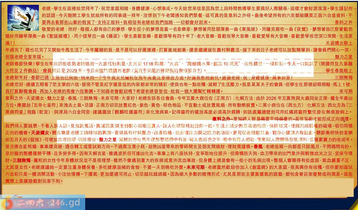 第031期《六合皇信箱文字版》10000%正確!!!正版二四六論壇*精心製作!!! 意料之外〗:天姿嬌女、魅力之星、春風、三捌無悔、未來可期,大家好!老總告訴各位會員,今年五黃大病位在(正南方):化解方法:由於2026年五黄煞與太歲同坐正南,屬全年最凶方位。應擺放「五帝七星符」來浊去土氣。忌諱:正南方切忌放置紅色、紫色、黄色、棕色物品,不宜動土或放置風扇、所有動態装置。二黑小病位在(西北方):化解方法:西北方為「黑病符星」飛臨(乾宮),與原局六白金同宮,建議擺放「麒麟旺運靈符」來化洩病氣。記得靈符的擺放高度必須高於肩膀,如該處屬牆壁則可用紅繩將靈符繫住掛在無痕掛鉤上。 【1】.老總,學生在這裡給您拜年了,祝您家庭和睦,身體健康,心想事成。今天給您來信是因為您上段時間教導學生要搞好人際關係,這樣才會財源滾滾。學生謹記你的話語,今天剛開工學生就給所有的同事逐一拜年,沒想到下午老闆通知我們聚餐,這可真的是意料之外呀。最後希望所有的六友都能購買正版六合皇資料,不要再去看那些山寨的假貨了,支持正版料。我相信有老總給我們指路,一切都會好起來。意料之外 〖意料之外〗:要知道人脈是需要平時保養的,互信互助才能形成正向循環。我們待人要誠懇、不看人説人話、見鬼説鬼話,真誠讃美與主動關心能吸引贵人,讓人在關鍵時刻拉你一把。生活上減少無意義的抱怨,保持微笑,便能形成積極的磁場,吸引同樣正向的機會。 【2】.敬愛的老總:你好,每個人都有自己的夢想,學生從小的夢想是當一名音樂家,夢想著用琵琶彈奏一曲《東風破》,用薩克斯吹一曲《夜驚》,夢想著自己穿著藍色婚纱用鋼琴彈奏一曲《聖誕婚禮》,用小提琴拉一曲《横梁》,學生喜歡音樂,喜歡彈琴有四十年了,老大音樂,喜歡祝琴大音樂,喜歡愛琴有大音樂,喜歡愛琴祝您笑口常開,生活美滿!!天姿嬌女敬上 〖天姿嬌女〗:聽音樂是老總工餘時候的興趣,音樂具有紓解壓力、改善情緒、提升專注力與記憶力的功能。更可促進睡眠質素,對身心健康大有益處。聽節奏明快的音樂如五月天的《倔強》,可增加血液循環消除疲勞。 【3】.年過完了,錢也花完了又開始牛馬生活了,今年屬猪的我,是不是可以好運連連,打算進城創業,還是繼續留在農村幹農活,接下來的日子老總可以放點簡單料,讓會員們開心一笑,祝福老總全家幸福。魅力之星 〖魅力之星〗:屬猪的你在馬年運勢整體穩中有進,屬太歲暗合之年,暗中有貴人相助,事業與人際關係發展順利,是積累實力的收成年。受月德吉星照耀,事業運突破,適合轉工或嘗試新方向。不過需注意小耗、劫煞凶星帶來的零碎開支及朋友間損財,理財需謹慎。 【4】.老師春節快樂!學生在年前節後收到老師送的一大波紅包利是,尤其是17.18兩期:“大蟲”、“爬樹摘水果、嗣款10萬元”,收穫頗豐,一掃前恥。今天一口筑請了(開運符及九紫離火符及2件飾品),會員期延至2029年。今日來信鬥膽請教老師(見首不見尾的神龍何時有縁現身?)。學生春風敬上 〖春風〗:老總信箱一向都是只談風月,不問碼問肖的。至於龍的整體運勢平穩,且多勞多得。因有天解吉星,雖遇波折但可逢凶化吉。事業上有八座扶持,宜爭取地位提升,但需慎防天狗、血刃帶來的出門意外與輕微血光之災,宜保守理財。 【5】.老總新年好,春節已過,上班也已開始,特來問一下今年我女兒屬蛇在馬年需要注意哪些方面。好讓我教她避坑。謝謝老總,祝:身體健康,萬事如意!三捌無悔 〖三捌無悔〗:屬蛇的女性今年身體狀況並不是很理想,雖然不會遇到重大的疾病或意外流血事故,但身體上總是會有一些小的毛病出現。整個人會顯得有些虚弱,氣,血嚴重不足,尤其是女性。老總建議她一定要注重身體保養,多吃健康滋補的食物,不要一天到晚吃外賣。 【6】.老總您好,連續五期看了您主筆的六信,發現不管是紅字還是信的內容都非常的精彩,使我也有一點收穫,減輕了生活壓力。我是某某夫子的會員,但學生在那裡卻期期輸,馬上1號,我打算辭職會員,再加入老總的馬會六信集團。不知道老會歡迎嗎?希望老總登登信,給我一個大圍幫忙轉轉運。未來可期 〖未來可期〗:老總當然歡迎你加入《創富網》的大家庭,很高興你有收穫,但你要知道玩六合彩只是一種消閒活動,小注怡情搏一下運氣,更加要適可而止,切忌越玩越過龍。因為絕大多數的賭博形式,尤其是那些主要靠運氣的遊戲,都包含著莊家優勢或利潤差。這些實際上是讓遊戲對玩家不利。 紅字:始終不懈 暗码:19243441 [释义]自始自终一直不松懈。 [出处]《青年作家应有的修养》:“同时,我们必须尖锐地指出:'骄傲自满就是勤学苦练、始终不懈的死敌。'”