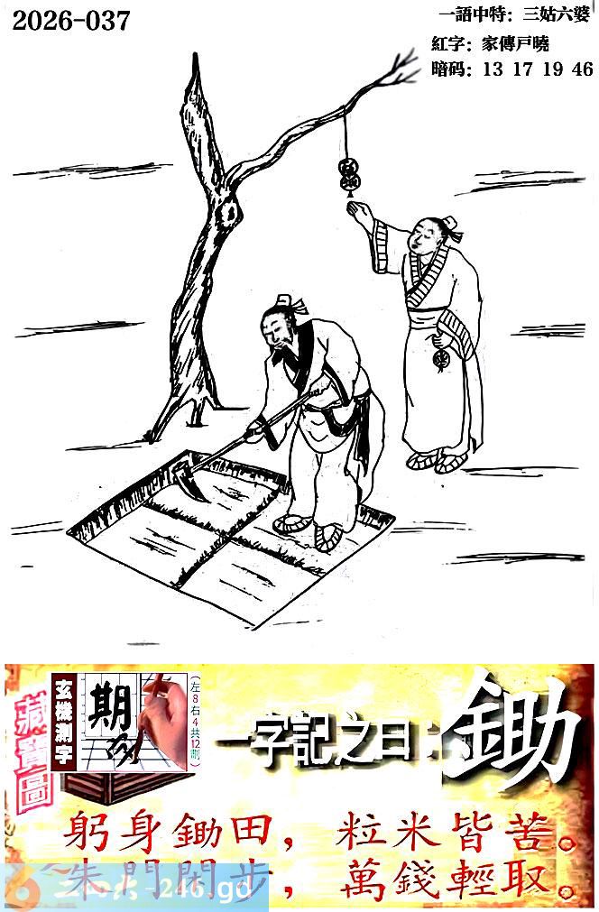 037期跑狗一字記之曰:【鋤】 躬身鋤田,粒米皆苦。 朱門閑步,萬錢輕取。