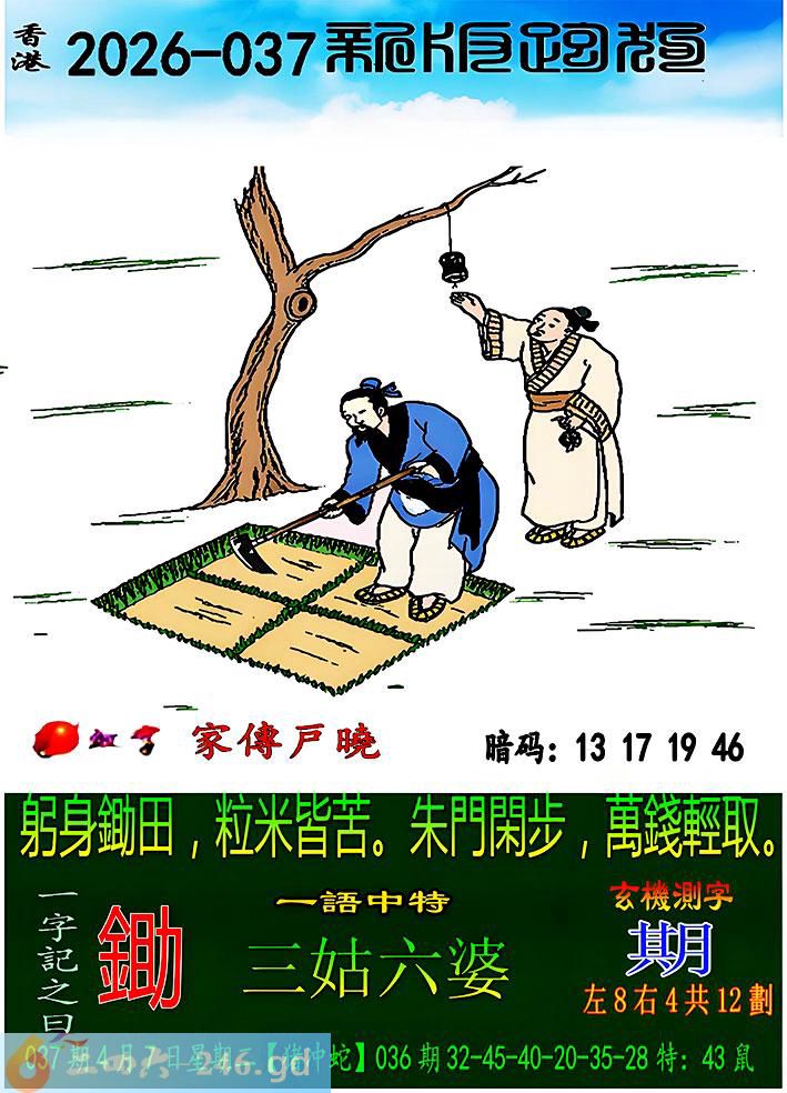 037期跑狗一字記之曰:【鋤】 躬身鋤田,粒米皆苦。 朱門閑步,萬錢輕取。 玄機測字:《期》 一語中特:三姑六婆