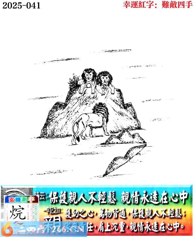 041期老版跑狗一字記之曰:【親】 詩雲:保護親人不輕鬆,親情永遠在心中。 護幼之心,萬物皆通,保護親人不輕鬆; 家庭責任,肩上沉重,親情永遠在心中。 玄機測字:《烷》